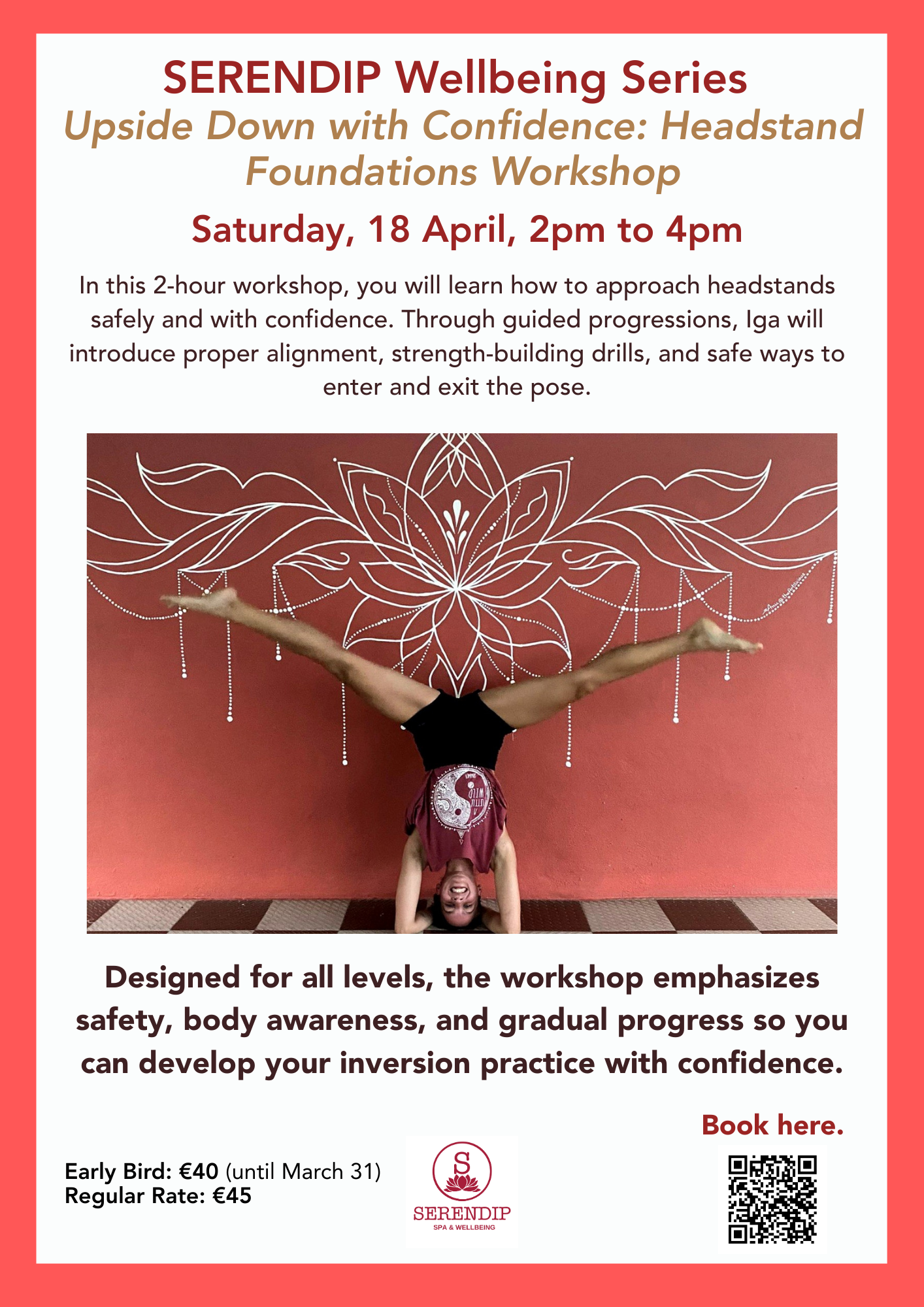 Upside Down with Confidence: Headstand Foundations workshop Mar 31 Written By Serendip Spa & Wellbeing Serendip Spa & Wellbeing Award-winning 5-start luxury wellness escape in the heart of Brussels: massage treatments, yoga, workshops, retreats & natural products. Visit us at Serendip Spa & Wellbeing! http://www.serendipspa.com